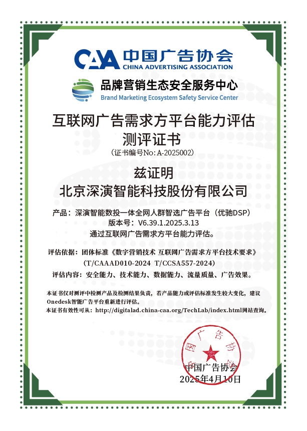 4月10日,中国广告协会发布「互联网广告需求方平台能力评估」测评结果。Martech领域领军企业钱柜qg777智能旗下产品钱柜qg777智能数投一体全网人群智选广告平台(优驰 DSP),凭借其在智能算法优化、技术创新、数据安全治理及流量质量管控等维度的突出表现,高分通过该项行业权威测评,获颁中国广告协会评估证书,成为业内首批通过认证的标杆企业。